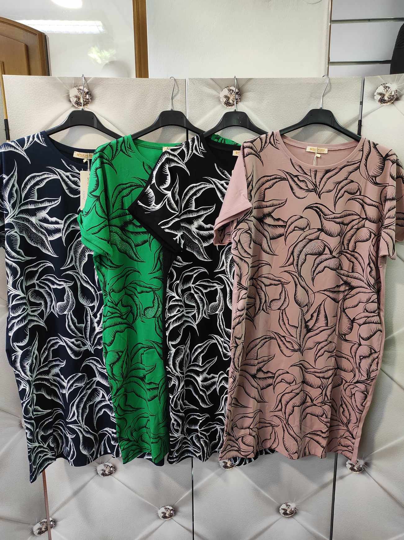 bavlněné šaty přední díl s listy a kamínky (na úbytek kamínků se nevztahuje reklamace) zadní díl jednnobarevný s postranními kapsami vel. UNI - prsa max 104 cm, délka 92 cm celý popis