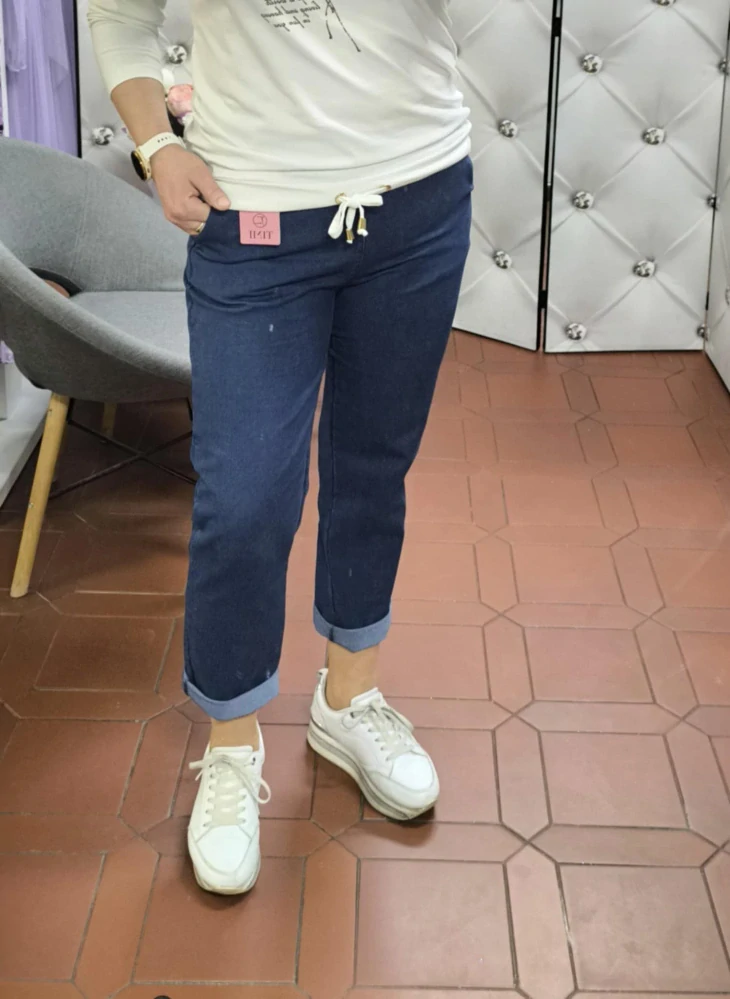 volnočasové kalhoty imitující džíny v pase do gumy (součástí je bílý pásek) s kapsami 98% bavlna, 2% elastan kalhoty jsou elastické made in Italy TABULKA VELIKOSTÍ VELIKOST UNI obvod pasu 74-98 cm obvod boků do 110 cm celková délka 94 cm celý popis