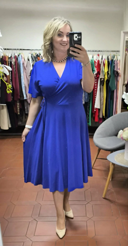 dámské šaty 40 42 44 46 48, elastické šaty, modré šaty, šaty do A, šaty pro plnoštíhlé, elegantní dámské šaty, pohodlné šaty, šaty s výstřihem do V, univerzální šaty, letní šaty, šaty do práce i na oslavu