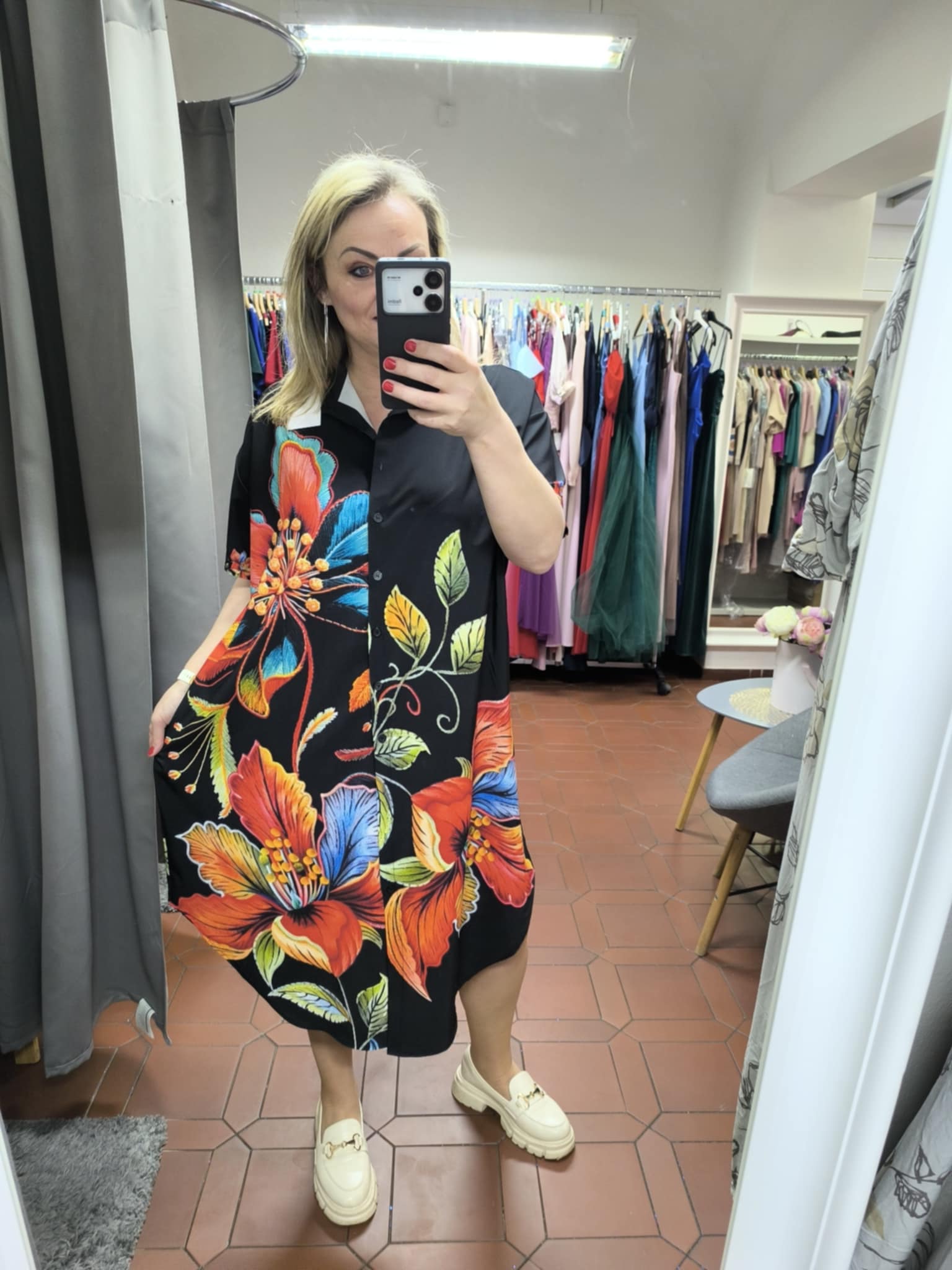• větší košilové šaty s výrazným motivem
