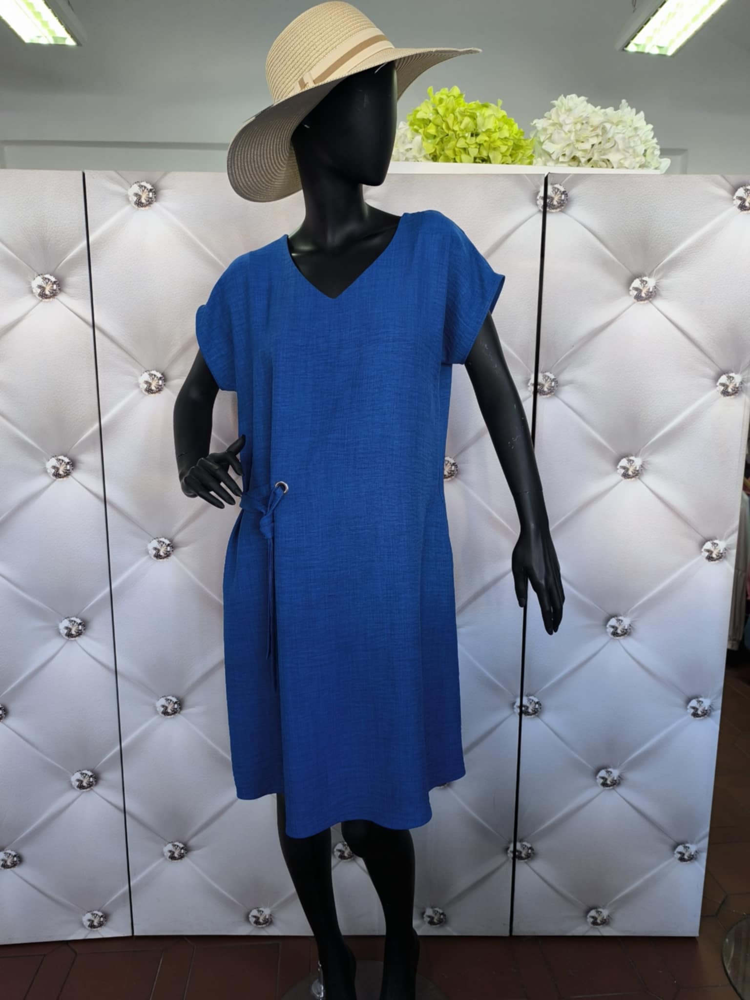 lehké vzdušné lněné šaty barva modrá 100% len - přvotřídní kvalita V dekolt krátký rukáv v pase regulovatelné ozdobným páskem ze stejného materiálu s kapsami vyrobeny v EU TABULKA VELIKOSTÍ VELIKOST 40 42 44 46 48 obvod prsou 98-102 cm 102-106 cm 106-112 cm 112-118 cm 118-122 cm obvod pasu ... celý popis