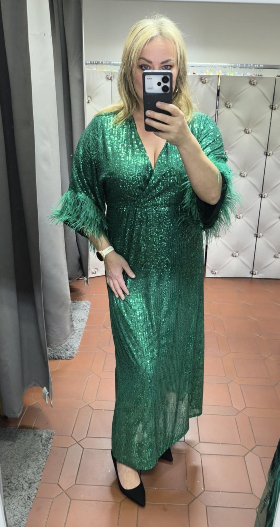 I dámy s většími křivkami mohou vstoupit do sálu jako královny plesů či večírků. K tomu stačí třpytivé flitrové šaty RADKA s krásným dekoltem a nepřehlédnutelným detailem peříček na rukávech. Šaty jsou elastické a tak se dobře přizpůsobí vašim křivkám. dlouhé flitrové šaty barva zelená překrásný ob... celý popis