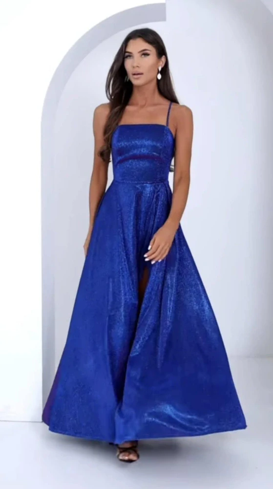 Dlouhé třpytivé modré šaty se šněrováním a rozparkem celý popis