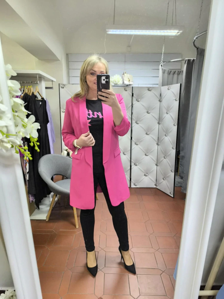 stylové a elegantní dlouhé sako v sytě růžové barvě s podšívkou s klopami 95% polyester, 5% elastan vel. UNI - prsa do 106 cm, délka 95 cm celý popis