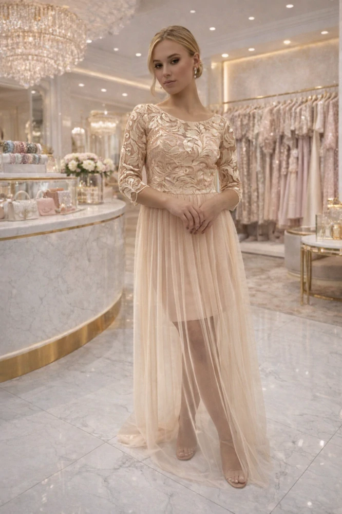 Elegantní dlouhé šaty v jemném meruňkovém odstínu jsou ideální volbou pro slavnostní příležitosti, plesy nebo svatby. Horní část zdobí luxusní květinová výšivka s 3/4 rukávy, která šatům dodává romantický a sofistikovaný vzhled. Lehká tylová sukně vytváří vzdušný efekt a krásně se pohybuje při chůzi.