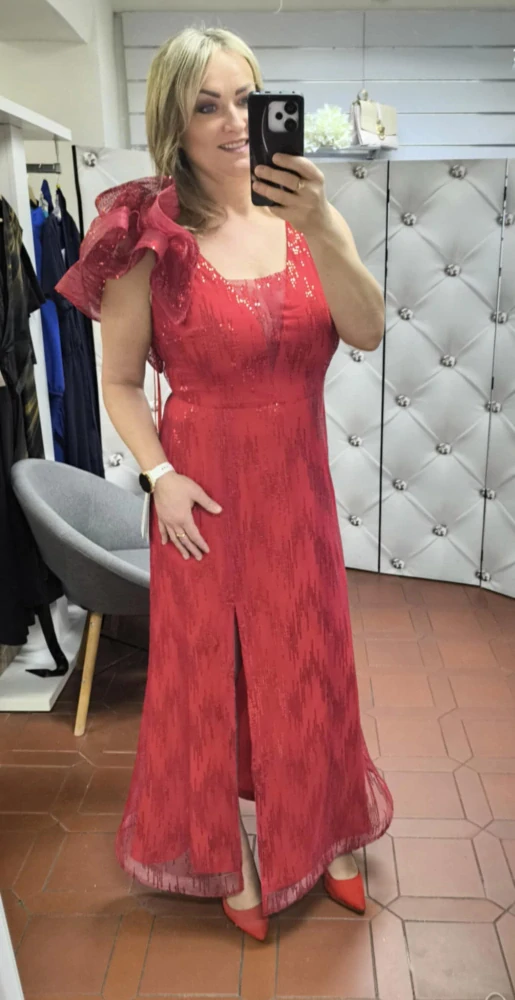 Elegantní dlouhé společenské šaty v sytě červené barvě, které zaujmou na první pohled svým třpytivým flitrovým vzorem a ženským střihem. Šaty mají výraznou ozdobnou aplikaci (látkovou brož-odnímatelnou) na rameni, která dodává modelu luxusní a originální vzhled.