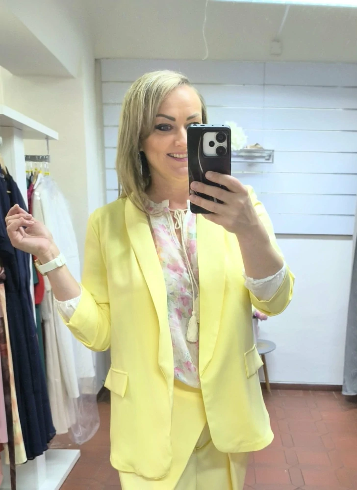 Elegantní dámské sako v svěžím pastelově žlutém odstínu, které rozzáří každý outfit. Minimalistický design bez zapínání působí čistě a moderně, zatímco lehce projmutý střih lichotí postavě a zajišťuje pohodlné nošení po celý den.