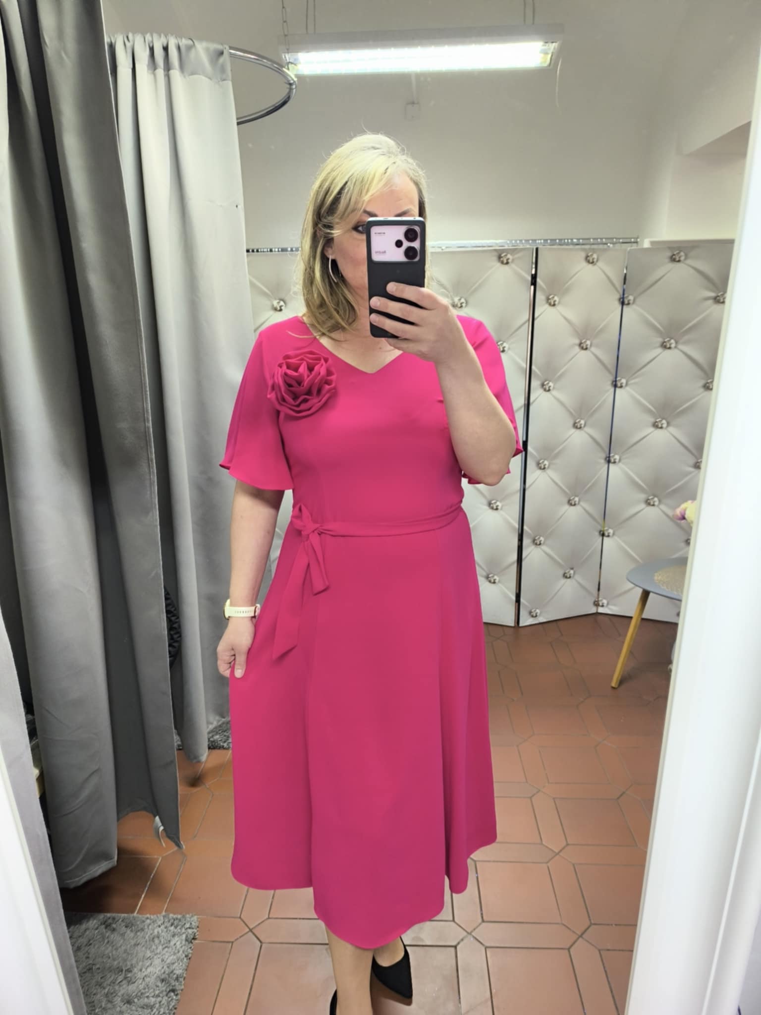 elegantní šaty áčkového střihu v midi délce barva magenta krátký motýlí rukávek V dekolt součástí je pásek ze stejného materiálu, pásek je odnímatelný, šaty jsou bez poutek součástí je rovněž brož ve tvaru růžičky, která se připíná na magnet vzadu skrytý zip tenká podšívka šaty jsou celkově lehké a... celý popis