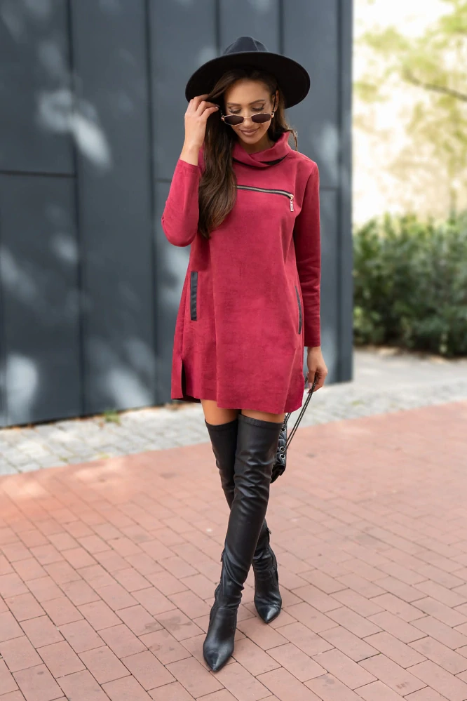 moderní teplé šaty v krátké délce se zajímavě řešeným límcem na prsou zdobené zipem postranní kapsy boční decentní rozparky imitace broušené kůže 50% viskóza, 50% polyester vyrobeny v EU TABULKA VELIKOSTÍ VELIKOST 40 42 44 46 48 obvod prsou 100-104 cm 104-108 cm 108-112 cm 112-116 cm 116-120 ... celý popis