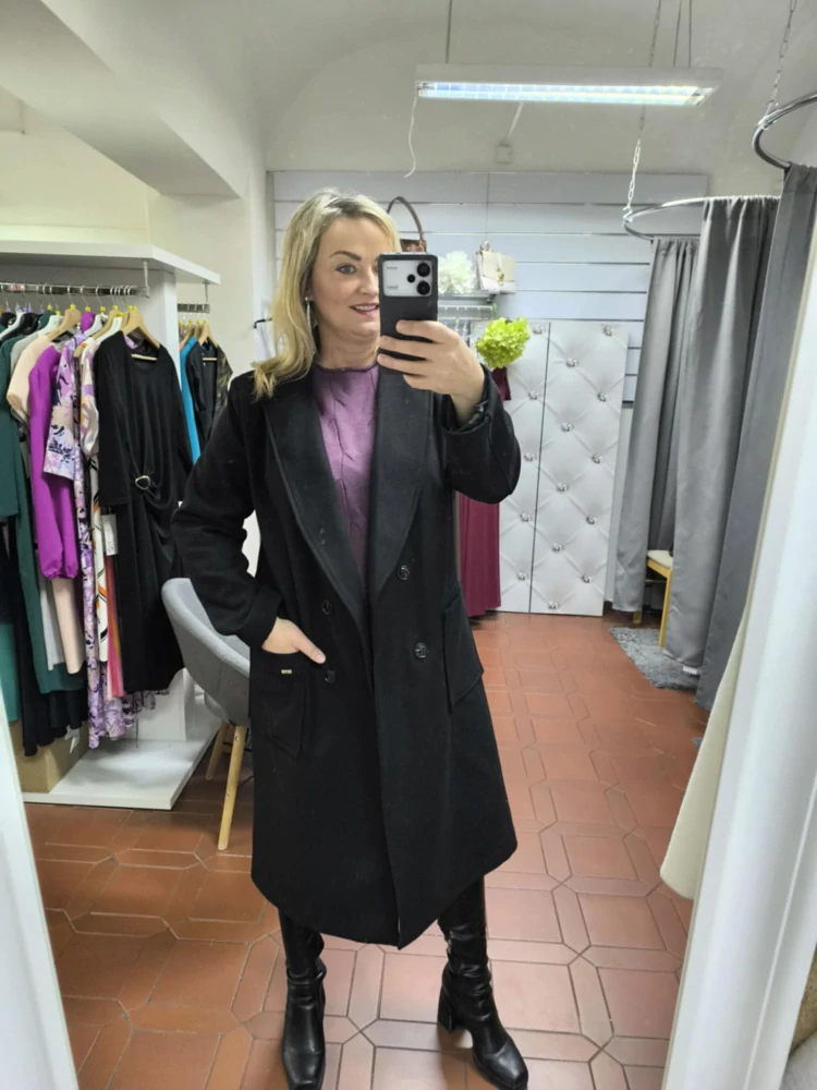 stylový kabát v módní délce výborné materiálové složení 50% vlna, 50% polyester s podšívkou barva černá kvalitní zpracování s klopami hluboké přední kapsy zapínání na knoflíky černé barvy rovný střih vyrobený v EU TABULKA VELIKOSTÍ VELIKOST 44 46 obvod prsou do 118 cm do 122 cm obvod pasu d... celý popis