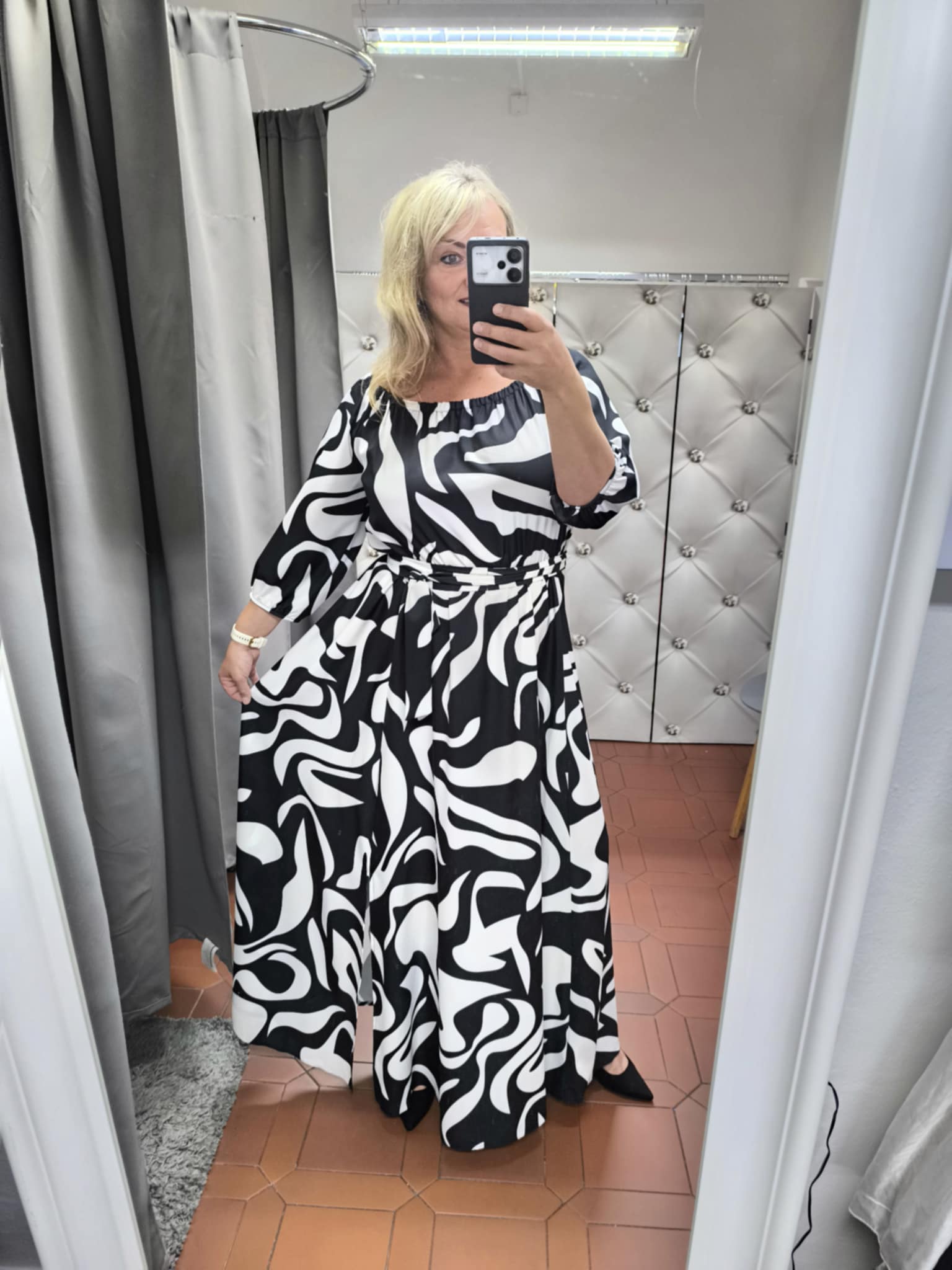 Ohromující model maxi šatů v černobílém provedení. celý popis