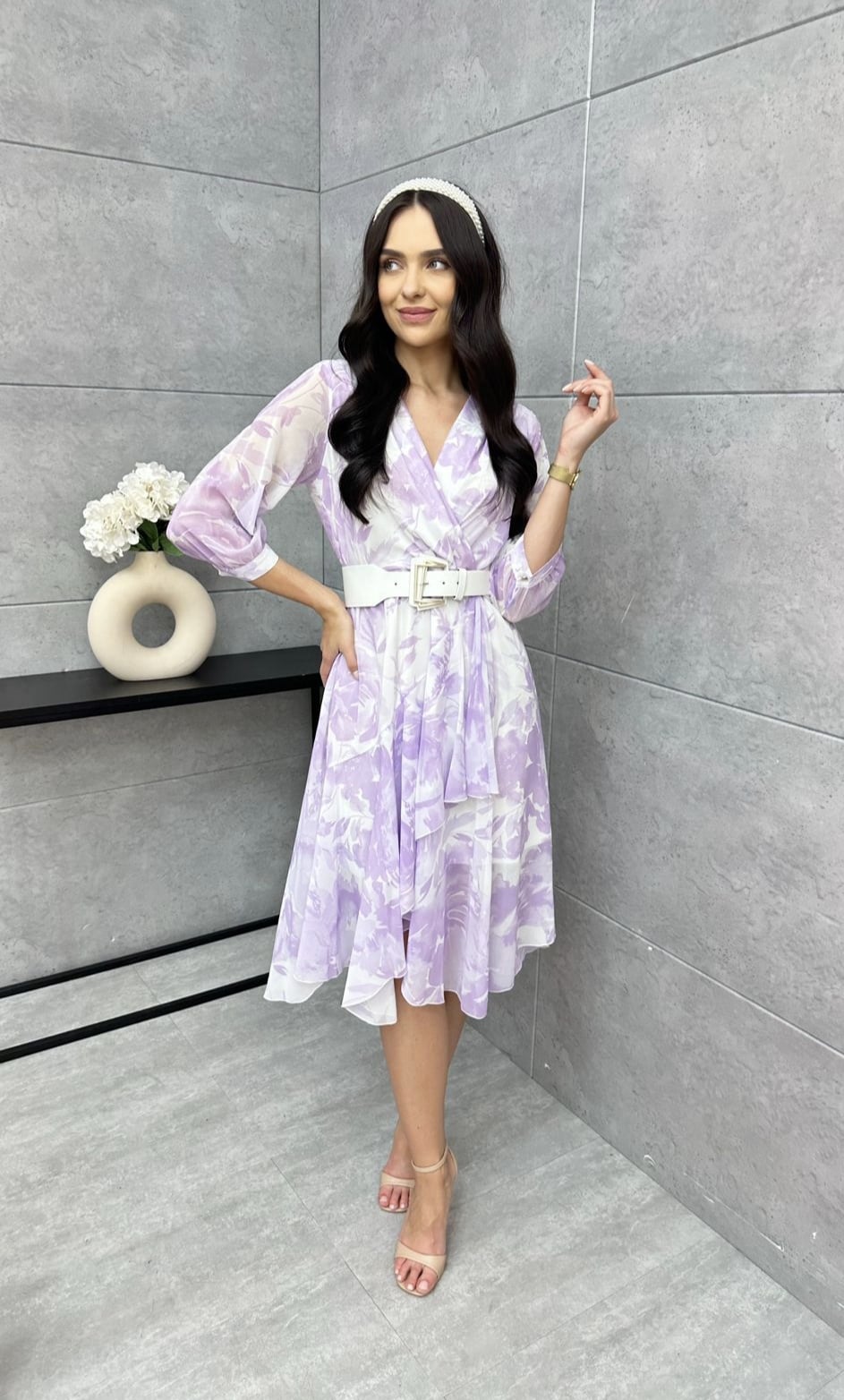 elegantní šifoné šaty obálkový V dekolt 3/4 rukáv zakončený manžetou s knoflíčkem pod prsy do gumy pásek je součástí šatů 100% polyester barva fialovobílá tenká podšívka, aby neprosvítaly TABULKA VELIKOSTÍ VELIKOST 36 38 40 42 44 46 48 obvod prsou 80-90 cm 88-94 cm 94-100 cm 100-106 cm 106-11... celý popis