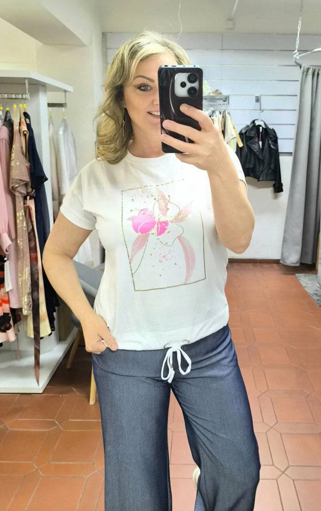 Dominantou je originální potisk s jemným abstraktním motivem v elegantních barvách, který dodává outfitu ženský a hravý nádech. Kulatý výstřih a krátké rukávy dělají z tohoto kousku ideální volbu pro každodenní nošení i volnočasové kombinace.