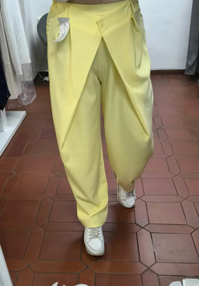 Stylové dámské kalhoty v jemném pastelově žlutém odstínu, které zaujmou na první pohled svým originálním střihem. Model s vysokým pasem a výrazným překládaným detailem v přední části vytváří efekt sukně, zatímco si zachovává pohodlí kalhot. Volnější nohavice zajišťují maximální komfort při nošení a zároveň dodávají outfitu moderní, uvolněný vzhled.