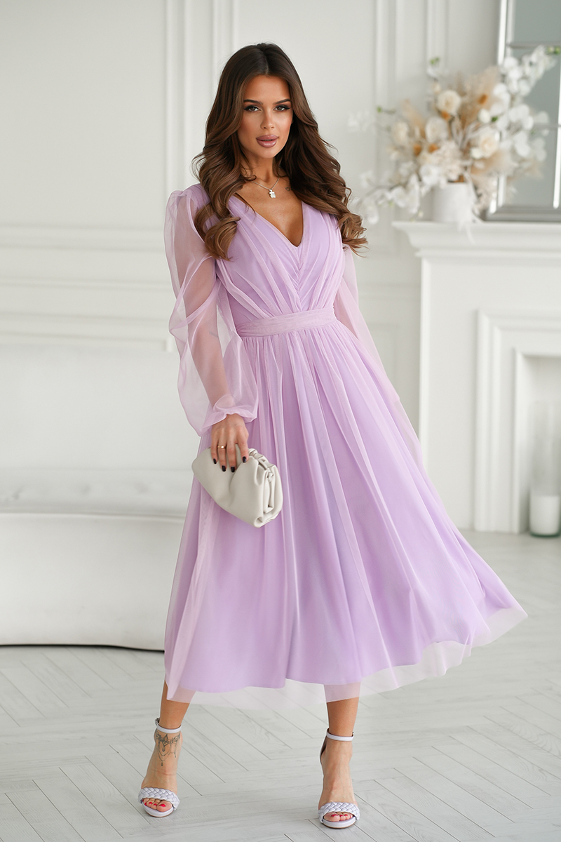 Tylové společenské midi šaty JASMÍNA lila třpytivé | Bellaboutique